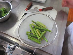前回の青菜とジャガイモに加え,アスパラガスとゆで卵をチョイスしたようです。 ちょっと,一仕事を済ませ,みんなの食べる様子を見ようと家庭科室に行くと・・・