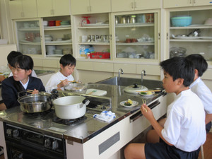 1校時に,5・6年生の家庭科は調理実習でした。青菜とじゃがいもをゆでて味付けをし,試食する学習です。 まず,調理の仕方を動画で確認します。 昨年度経験済みの6年生が,包丁の使い方などを5年生にアドバイスします。 5年生にとっては,はじめての調理実習。シンプルな味で,美味しかったようです。